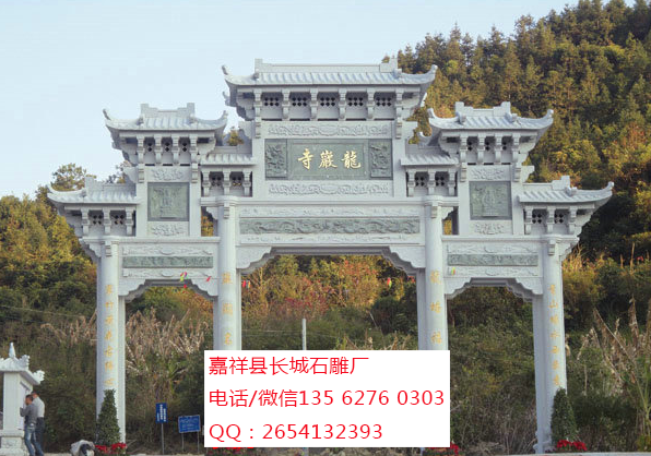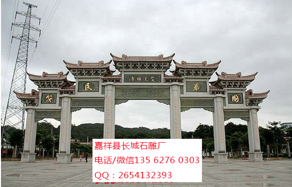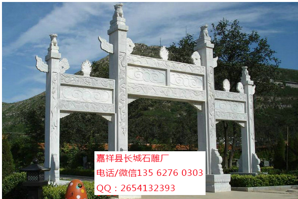 有花崗巖石雕牌坊、大理石石雕牌坊。花崗巖石雕牌坊常用青石石雕牌坊、芝麻白石雕牌坊、銹石石雕牌坊等。大理石石雕牌坊則常用漢白玉石雕牌坊。根據需要來選擇材料制造石雕牌坊。石雕牌樓以景園、街道、陵墓前為多。石雕牌坊從結構上看繁簡不一,有的石雕牌坊極簡單,只有一間二柱,無明樓;復雜的石雕牌坊有五間六柱十一樓者。石雕牌坊由于本身的結構特點,有的雖為三間四柱式,卻只有花板而無明樓。石雕牌坊的明樓比較復雜,浮雕鏤刻亦極有特色。如果石雕牌坊石料石質堅細,不僅浮雕生動,而且其精細的圖案歷經數百年也不泯沒。